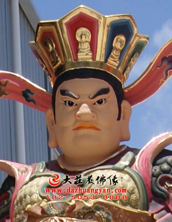 品名:多闻天王 身份:佛教护法神,材质:生漆脱胎,表面工艺:彩绘描金,大庄严佛像工艺有限公司 产品编号:【2417】。