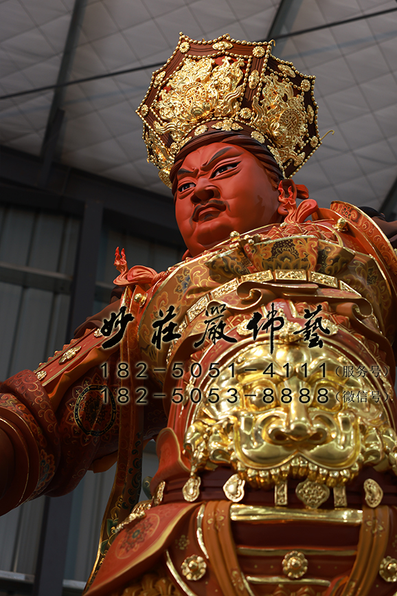 西方广目天王是佛教四大天王之一,掌管西牛贺洲,主要负责护持众生、观察世界。其形象面部呈红色,身着甲胄,手持龙首蛇身法器或宝珠,象征以智慧和洞察力护法。 “广目”意为“以净天眼观察世界”,其护法职责源于佛教典籍中“护持人民”的设定,常被视为智慧与理性的化身。在佛教的宏大世界里,广目天王肩负守护西牛贺洲的重任,统领着龙族、毗舍阇等部众,以敏锐的天眼注视着世间,护持着这片土地与众生,让人们在无常的世间,找寻到内心的安定与智慧。