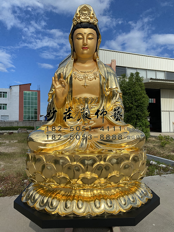 观音菩萨是西方三圣之一,当众生遇到任何难处与痛楚时,若能以诚心称念观世音菩萨,便可获观音救护。而且观世音菩萨对不同的人群现化不同的身相。观音菩萨随类化身有如鱼篮观音、送子观音、白衣观音、海岛观音、八臂观音、千手千眼观音等。观音菩萨是佛教慈悲与智慧的象征,在我国传统文化中占据至关重要的地位,历来是民间信仰的代表,受到广大民众的尊崇和供奉。图中观世音菩萨佛像是大庄严佛像厂家制作的,观音菩萨面庞圆润丰满,端庄慈祥,头戴宝冠,宝冠中央有一尊小阿弥陀佛,手持净瓶,盘腿坐在莲花台上。