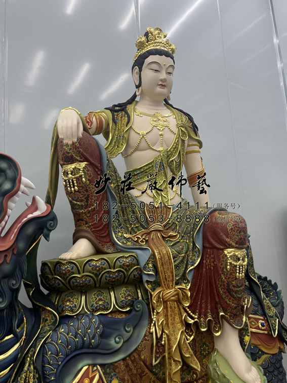 文殊菩萨,又被称为文殊师利、曼殊室利、法王子,是佛教四大菩萨之一,也是七佛之师,一切菩萨之母,身紫金色,五髻冠其顶,右手持金刚宝剑,表智慧猛利,能断一切烦恼。左手持青莲花,花上有金刚般若经卷宝,象征所具无上智慧,坐骑为狮子,象征其威猛。文殊菩萨是无上圆满智慧的象征,故称为大智文殊师利菩萨。经中记载文殊菩萨因无量劫来修菩萨行,福德甚深,感得出生时有十种瑞相。文殊菩萨与普贤菩萨同为释迦牟尼佛左右胁侍,世称“华严三圣”。应化道场为山西五台山。据《文殊师利般涅槃经》所记载:文殊菩萨是舍卫国多罗聚落梵德婆罗门之子。后来诣仙人处,求出家法,却无酬对者,乃皈依佛,出家学道,住首楞严三昧,行稀有难事,佛涅槃后五千四百岁时至雪山,为五百仙宣畅演说十二部经,后还本生地,在尼拘楼陀树下入涅槃。根据佛教典籍所载,文殊菩萨是过去世无量诸佛的老师,曾经引导无数的修行者证得佛果。在《放钵经》中,佛陀也说过:今我得以成佛,都是文殊菩萨的恩德!过去无数诸佛,也都是文殊师利弟子,未来当成佛者,也都是文殊菩萨威神力所致。就好像世间的小孩有父母一样,文殊菩萨是一切众生在佛道中的父母。